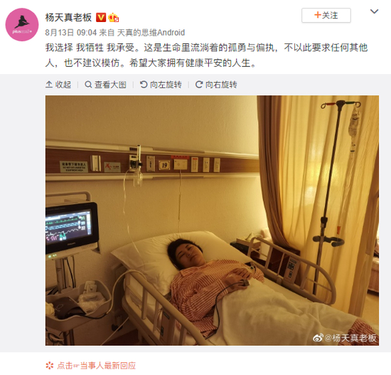 苏提了解切胃手术的契机和大部分网友一样,都是来自于“杨天真切胃真的瘦了”的大数据推送。据去年8月,网红明星经纪人杨天真所发布的微博,她本人患糖尿病六年,还有并发症。做切胃手术,是为了快速降血糖。