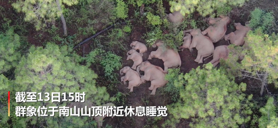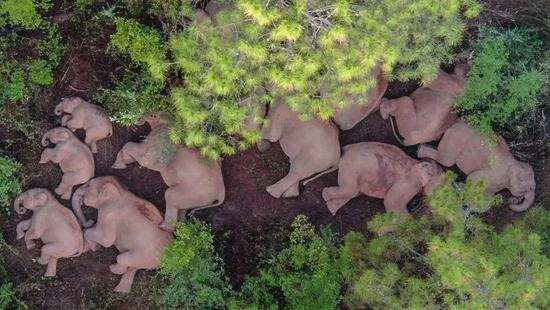 近日,无人机拍摄到的北迁象群“超萌睡姿”在网络上刷屏。这段画面由云南省森林消防总队的象群监测人员拍下。连日来,云南北迁象群引发社会广泛关注。