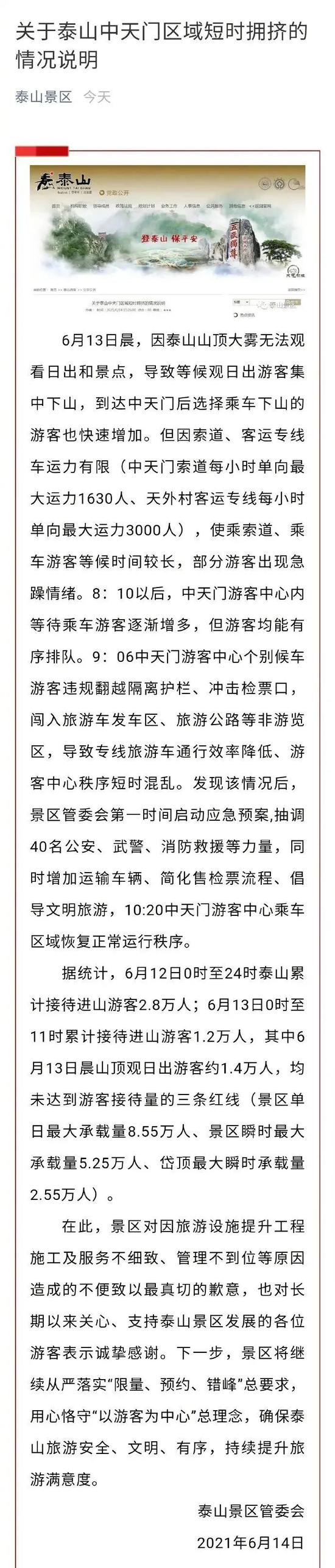 泰山景区14日发布情况说明称,13日晨,因泰山山顶大雾无法观看日出和景点,导致等候观日出游客集中下山,到达中天门后选择乘车下山的游客快速增加。但因运力有限,使乘索道、乘车游客等候时间较长,部分游客出现急躁情绪。个别候车游客违规翻越隔离护栏、冲击检票口,闯入旅游车发车区、旅游公路等非游览区,导致专线旅游车通行效率降低、游客中心秩序短时混乱。对此,景区管委会启动应急预案,增加运输车辆、简化售检票流程,10:20中天门游客中心乘车区域恢复正常运行秩序。景区同时对因旅游设施提升工程施工及服务不细致、管理不到位等原因造成的不便致歉。