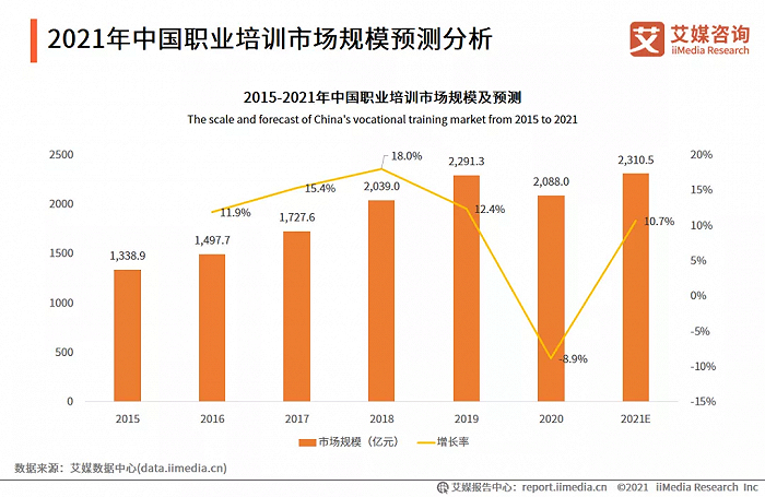 6月15日,艾媒咨询发布《2021年中国职业培训市场研究报告》(下称《职业培训报告》)预计,2021年中国职业培训市场将恢复到疫前水平,达2310.5亿元,同比增长10.7%。