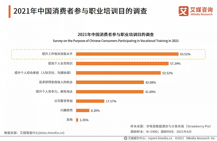 艾媒咨询预测,部分中小培训机构将会加速出清,同时职业培训机构的准入门槛也提高,将有助于规范职业培训市场发展。