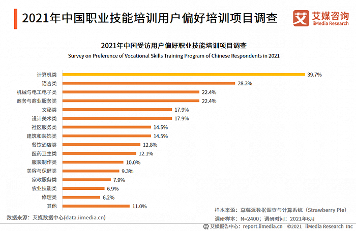 计算机类培训是受访用户参与度最高的职业技能培训项目。《职业培训报告》统计,近四成用户体验过计算机类培训,28.3%的用户体验过语言类培训,接着是机械与电工电子类、商务与商业服务类培训。