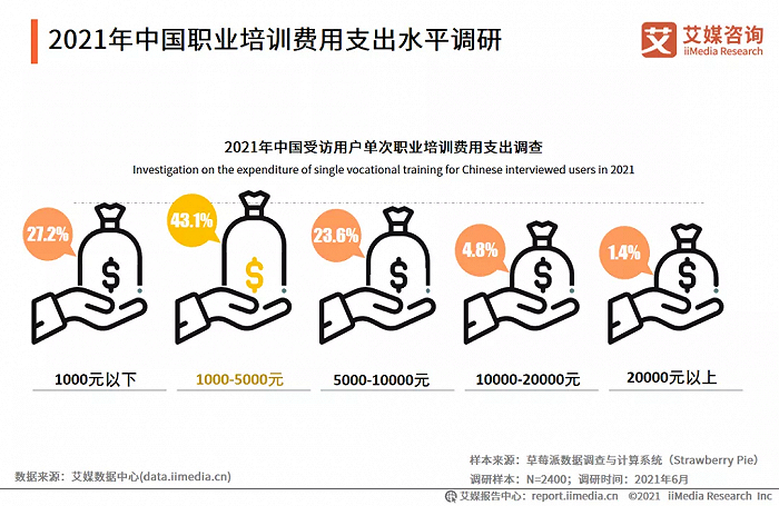 艾媒咨询认为,职业培训作为非刚性消费品,加上市场上服务产品质量参差不齐以及互联网开放学习资源的冲击,用户对课程价格敏感性相对较高。