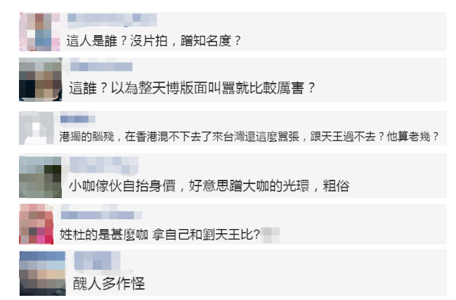 有网友问杜汶泽:“这人是谁?没片拍,蹭知名度?”“这谁?以为整天博版面叫嚣就比较厉害?”“小咖家伙自抬身价,好意思蹭大咖的光环,粗俗。”“在香港混不下去了来台湾还这么嚣张……他算老几?”↓