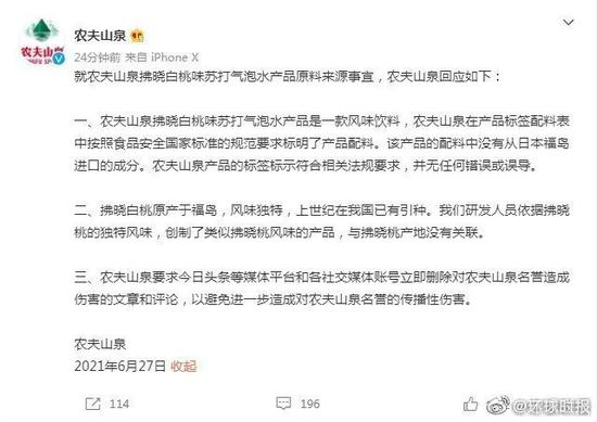 就拂晓白桃味苏打气泡水产品原料来源事宜,农夫山泉6月27日上午在微博回应称:农夫山泉拂晓白桃味苏打气泡水产品是一款风味饮料,农夫山泉在产品标签配料表中按照食品安全国家标准的规范要求标明了产品配料。该产品的配料中没有从日本福岛进口的成分。农夫山泉产品的标签标示符合相关法规要求,并无任何错误或误导。
