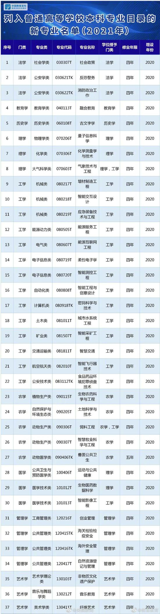 教育部最新版高校招生专业目录中,今年新增37个本科专业,其中约1/3是电子信息类和人工智能类,包括智能采矿、智慧交通等。近年来大类招生成趋势,即先进行一年的通识教育、再确定专业方向,填报此类志愿时,要多了解专业分流方式和相关的转专业政策,祝大家都能进入心仪的大学!