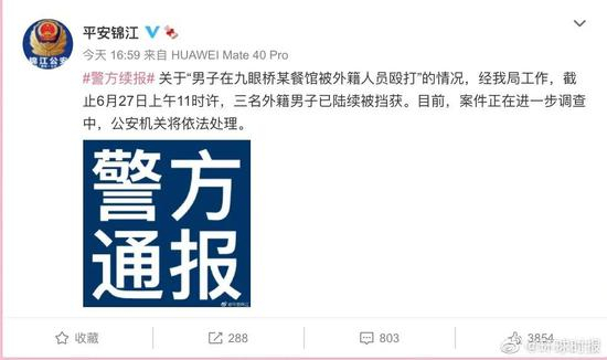 据@平安锦江:关于“男子在九眼桥某餐馆被外籍人员殴打”的情况,经我局工作,截止6月27日上午11时许,三名外籍男子已陆续被挡获。目前,案件正在进一步调查中,公安机关将依法处理。