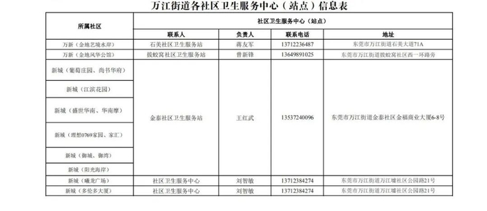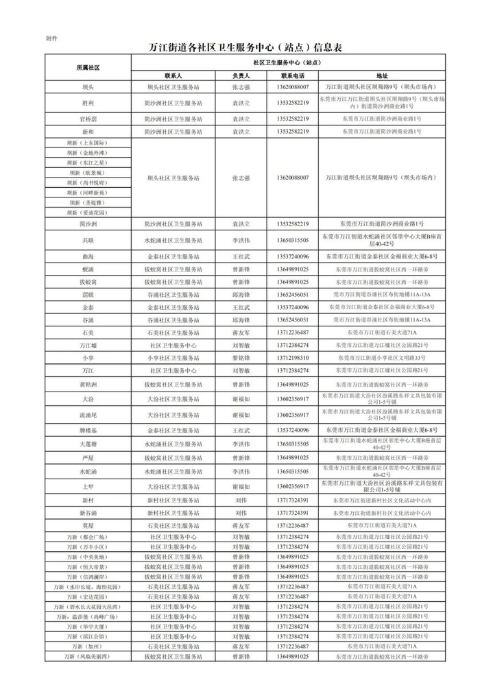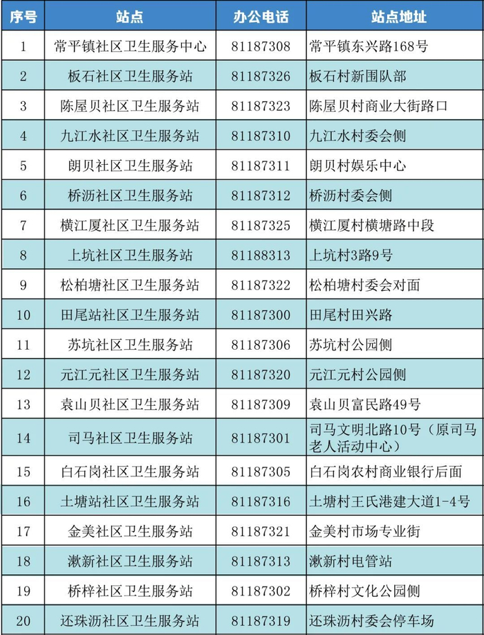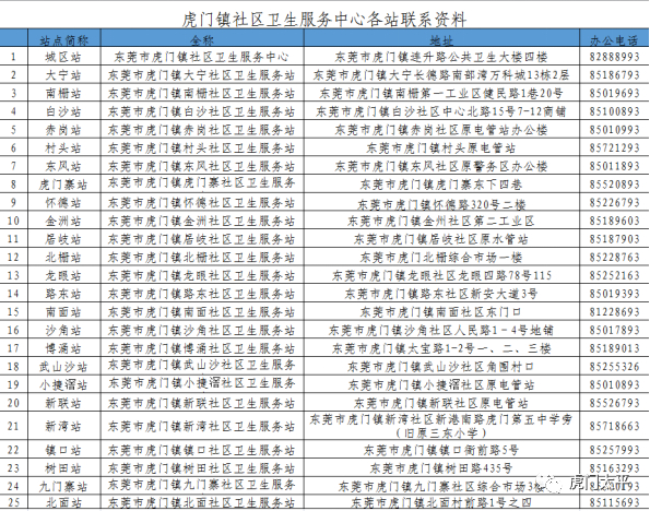 厚街镇社区卫生服务中心、三屯站、河田站、湖景站、涌口站、桥头站、宝塘站、白濠站、赤岭站、陈屋站、厚街站、汀山站、寮厦站、新围站、大迳站、新塘站、双岗站、溪头站、下汴站。