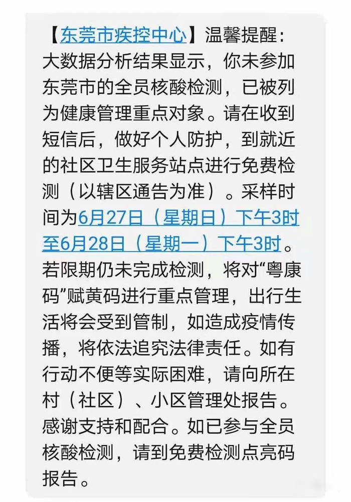 根据大数据的分析结果,市疫情防控指挥部已经向近日未参与核酸检测的市民发出短信。短信提醒,这部分市民请做好个人防护,就近到社区卫生服务站点进行免费检测(以辖区通告为准)。