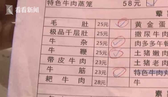 明女士向记者展示了当时的点菜单:“对,应该是6、7个人的样子,点的毛肚、牛杂、牛鞭、牛筋,牛身上的点了4个,这里点了个嫩肉片、鹌鹑蛋 、火腿肠。”