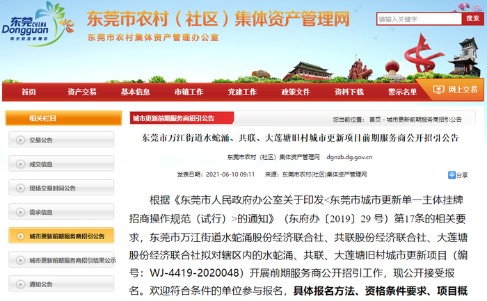 近日,东莞市农村(社区)集体资产管理网发布了“东莞市万江街道水蛇涌、共联、大莲塘旧村城市更新项目前期服务商公开招引公告”。