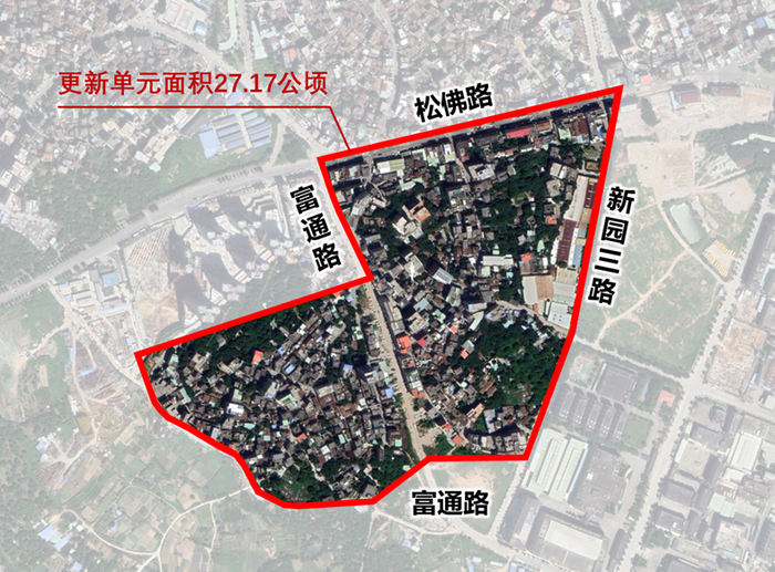 该项目位于大朗镇西部松佛片区,紧邻松山湖生活区,北至松佛路,南至富通路,东至新园三路,占地面积约27.17公顷(折合约408亩)。现状建筑物主要为旧村房屋和旧厂物业(最终单元范围以政府批准的单元划定方案为准)。