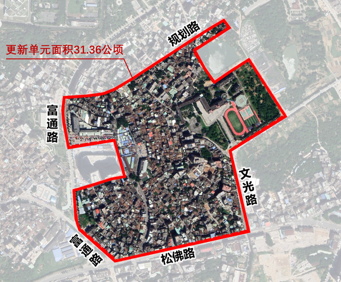 该项目位于大朗镇西部松佛片区,紧邻松山湖生活区,北至规划路,南至松佛路,西至富通路,东至文光路,占地面积约31.36公顷(折合约470亩)。现状建筑物主要为旧村房屋和旧厂物业(最终单元范围以政府批准的单元划定方案为准)。