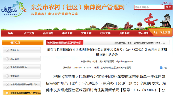 近日,东莞市农村(社区)集体资产管理网发布了“东莞市长安镇咸西社区咸西旧村商住类更新单元【编号:CA-(XX002)】公开招引前期服务商中选公告”。