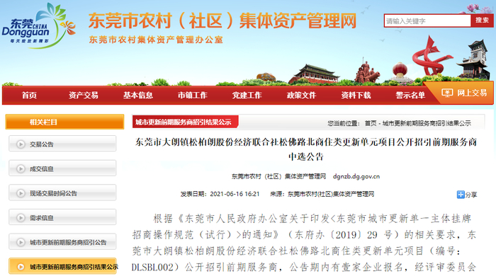 近日,东莞市农村(社区)集体资产管理网发布了“东莞市大朗镇松柏朗股份经济联合社松佛路南商住类更新单元项目公开招引前期服务商中选公告”。