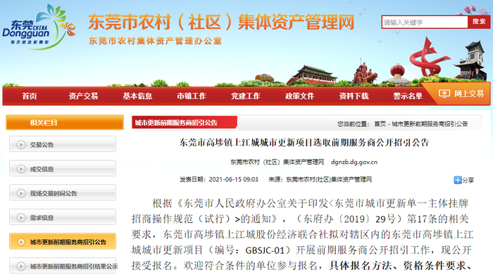 高埗镇近日,东莞市农村(社区)集体资产管理网发布了“东莞市高埗镇上江城城市更新项目选取前期服务商公开招引公告”。
