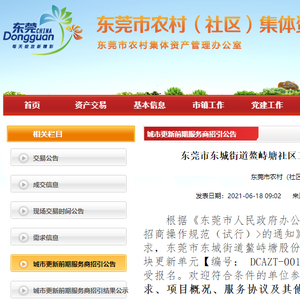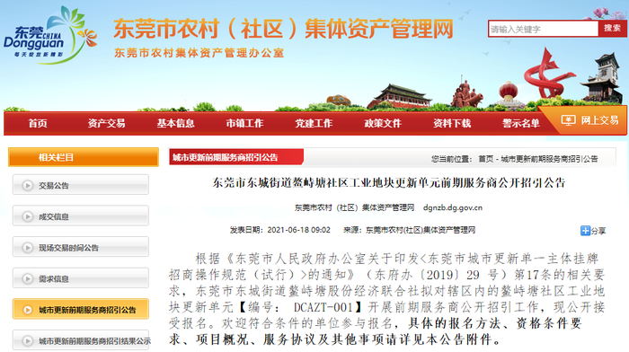 近日,东莞市农村(社区)集体资产管理网发布了“东莞市东城街道鳌峙塘社区工业地块更新单元前期服务商公开招引公告”。
