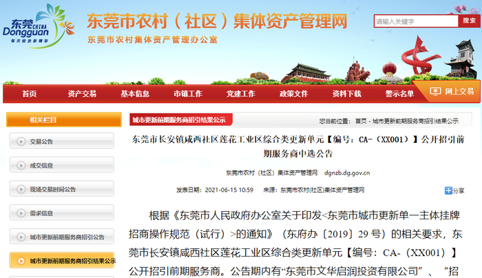 近日,东莞市农村(社区)集体资产管理网发布了“东莞市长安镇咸西社区莲花工业区综合类更新单元【编号:CA-(XX001)】公开招引前期服务商中选公告”。