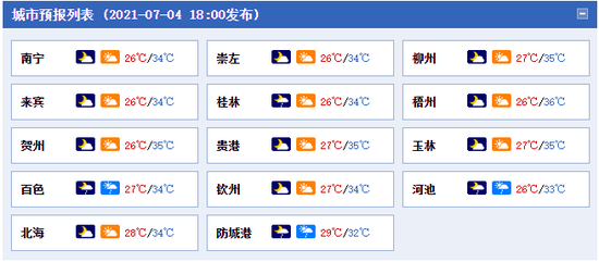 南宁市:多云,偏南风1~2级,最低气温26℃,最高气温34℃。