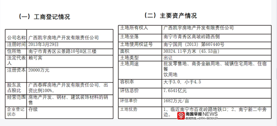 凯宇公司公司主要资产是位于南宁市青秀区高坡岭路西侧的一块地,这块地面积为30324.11平方米(45.53亩),评估总值为7.6541亿元,此前在司法拍卖中流拍。