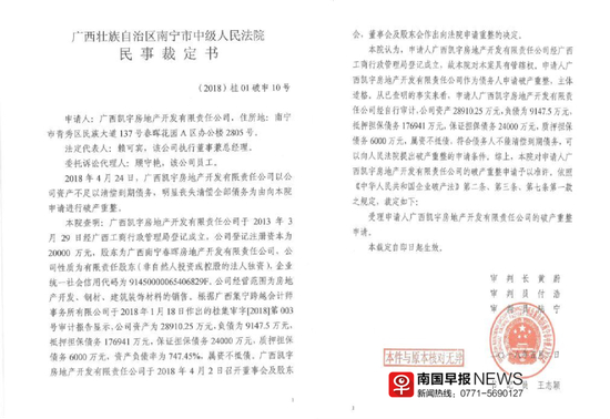 南宁市中级人民法院的相关法律文书显示,凯宇公司因未能清偿到期债务,向法院申请破产重整,南宁市中级人民法院于2018年5月2日裁定受理凯宇公司破产重整,并指定广西欣和律师事务所为凯宇公司管理人。