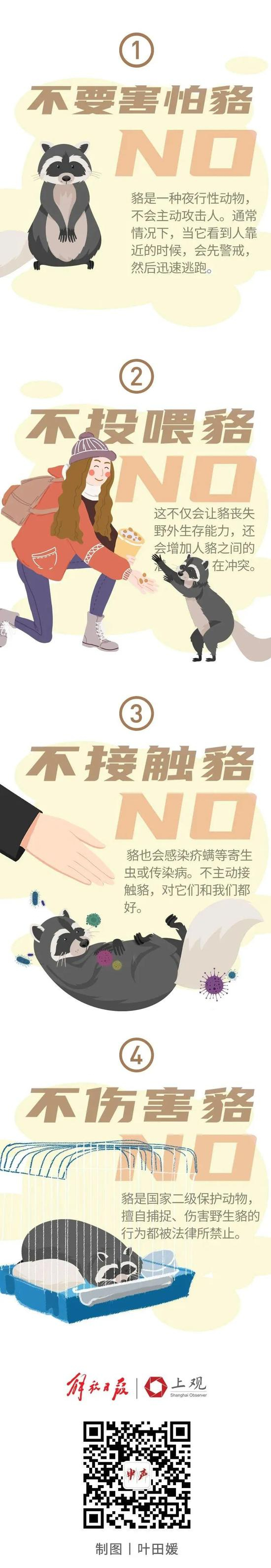除了不投喂之外,山水自然保护中心与复旦大学王放保护生物学研究团队联合发起的一项调查中还建议:市民如果偶遇貉,还应该“视而不见”,具体应该做到——