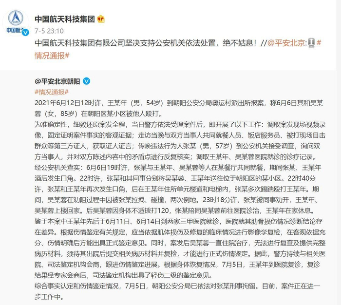 7月5日晚,针对“航天投资控股有限公司董事长张陶酒后打人”一事,北京市公安局朝阳分局通报:张陶已被刑拘。对此,中国航天科技集团有限公司表示坚决支持公安机关依法处置,绝不姑息。此前,中国航天科技集团已作出对张陶暂停履职、配合调查的决定。