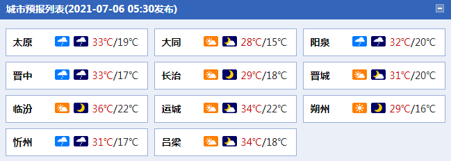 今天白天:全省多云间晴天,大同、忻州、太原、阳泉、晋中等地的部分地区和吕梁的局部地区有阵雨或雷阵雨;临运盆地的部分地区有35℃以上的高温天气。最高气温:全省29~36℃。