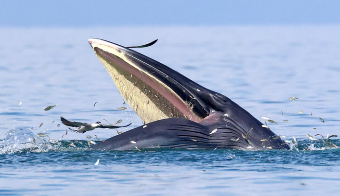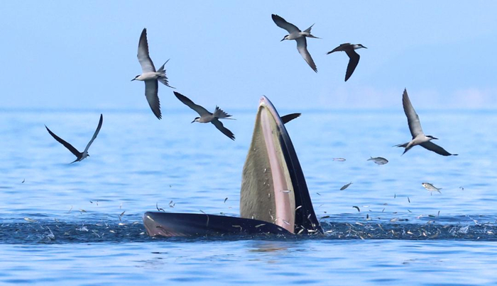 布氏鲸,还有一群好朋友——燕鸥群,它们是人们观察布氏鲸的“探测仪”。这天,跟着燕鸥群,记者远远看到布氏鲸张开了大嘴巴捕食,燕鸥们一哄而上抢鲸鱼嘴里的小鱼吃。