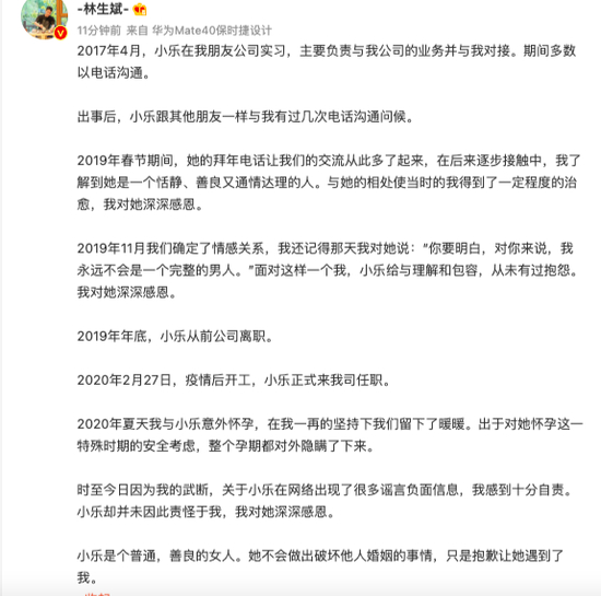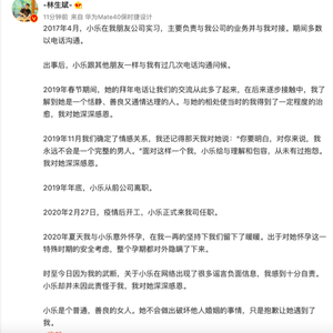 林生斌说,2019年春节期间,他们交流多了起来,2019年11月确定了情感关系。2019年年底,小乐从前公司离职。2020年2月27日,疫情后开工,小乐正式来他的公司任职。