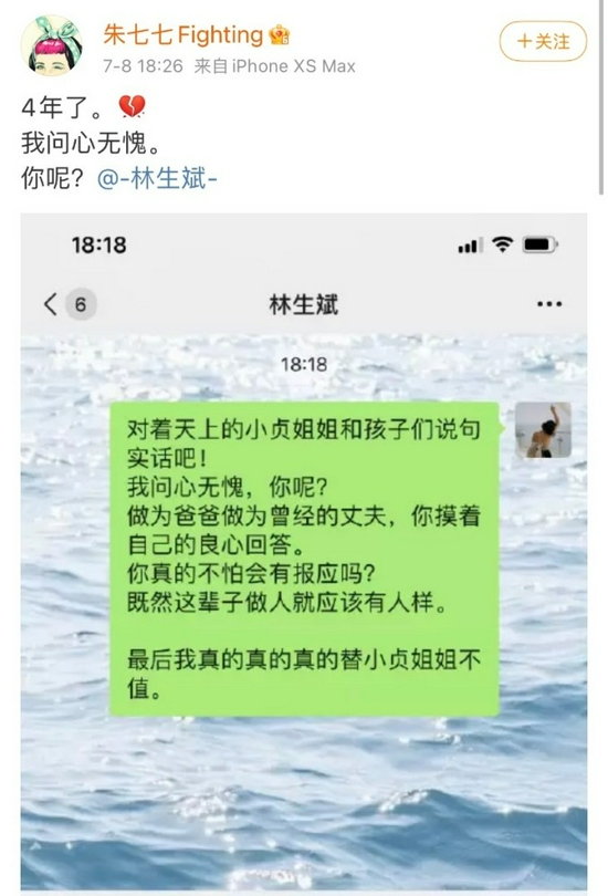 原标题:朱小贞妹妹发文质问林生斌:4年了,我问心无愧,你呢?