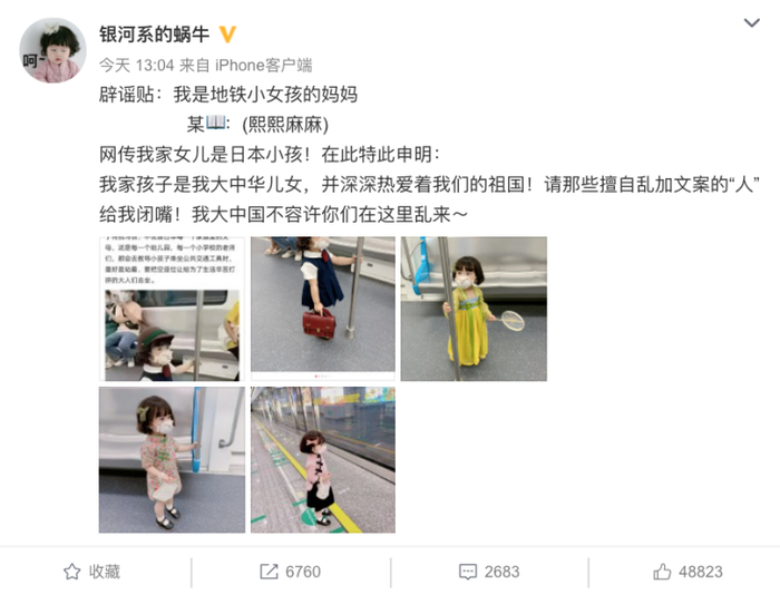 【环球网报道 记者 张晓旭】“网传我家女儿是日本小孩!在此特此申明:我家孩子是我大中华儿女,并深深热爱着我们的祖国!”今日微博,热传一位母亲的辟谣。