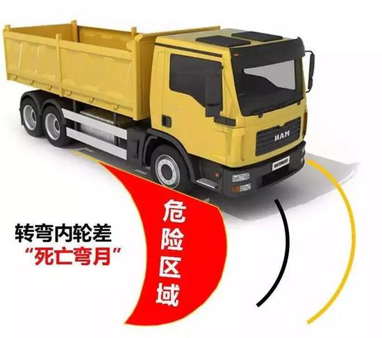 即大货车在右转弯过程中,由于内轮差(前后轮转弯半径不同)而出现的一处弯月形状的区域,这处区域最危险,又称“死亡地带”!
