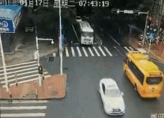 一辆白色电动摩托车和一辆大型厢式货车相撞