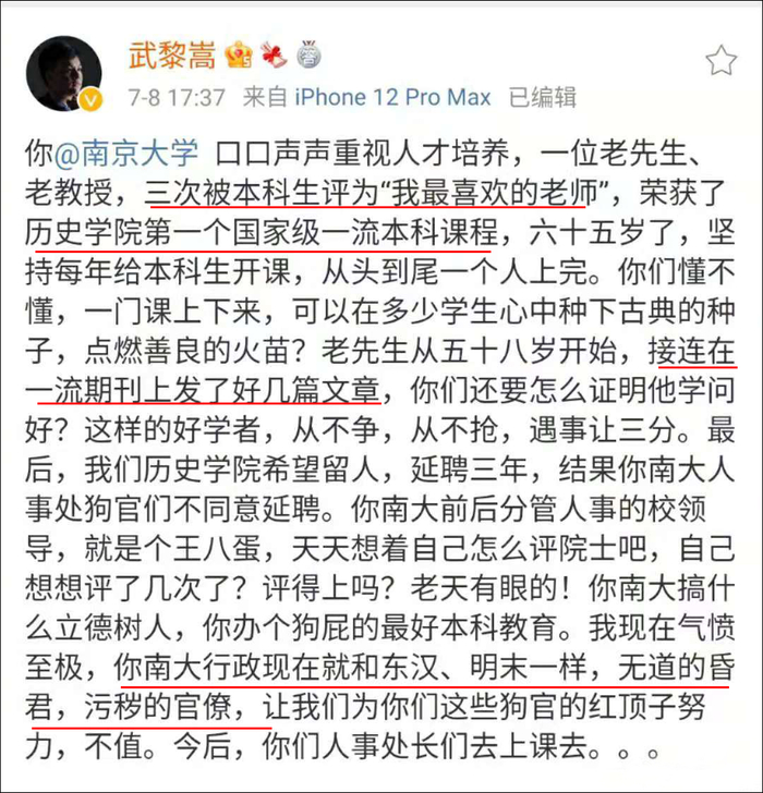 武黎嵩写道:“你@南京大学 口口声声重视人才培养,一位老先生、老教授,三次被本科生评为‘我最喜欢的老师’,荣获了历史学院第一个国家级一流本科课程,六十五岁了,坚持每年给本科生开课,从头到尾一个人上完。你们懂不懂,一门课上下来,可以在多少学生心中种下古典的种子,点燃善良的火苗?老先生从五十八岁开始,接连在一流期刊上发了好几篇文章,你们还要怎么证明他学问好?这样的好学者,从不争,从不抢,遇事让三分。最后,我们历史学院希望留人,延聘三年,结果你南大人事处……不同意延聘。”