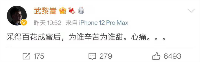 8日晚间,武黎嵩删除了这条微博,不过他又发文:“采得百花成蜜后,为谁辛苦为谁甜。心痛……”
