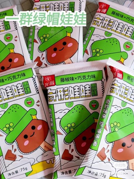 5月11日,光明冷饮宣布推出新品“小绿帽”奇形娃娃雪糕。这个熟悉的“小娃娃”可不简单,清新的绿色部分其实是藤椒口味,醇厚香甜的牛奶巧克力交织微麻的藤椒,嘶,想想这荒诞的口腔体验。