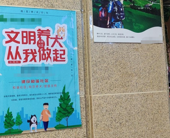 记者注意到,该小区门口还张贴着数张“文明养犬,从我做起”的宣传海报,一位工作人员告诉记者,这些海报并不是现在贴的,而是很早就贴出来宣传的。海报上面写着:“加强犬类管理,倡导文明养犬,首先就当从养狗人入手,要把规范养狗的规矩立在前面,把宣传教育做在前面,同时以严惩不文明养狗行为。”