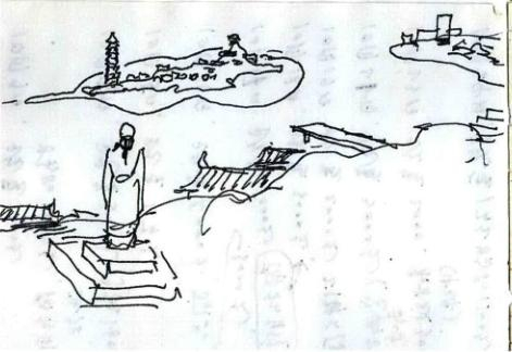 一个大大的惊叹号,彷佛能看出他心情烦乱,之后又画了两副线描:孤帆远影,群山寂寥,一个孤单的身影眺望远方……