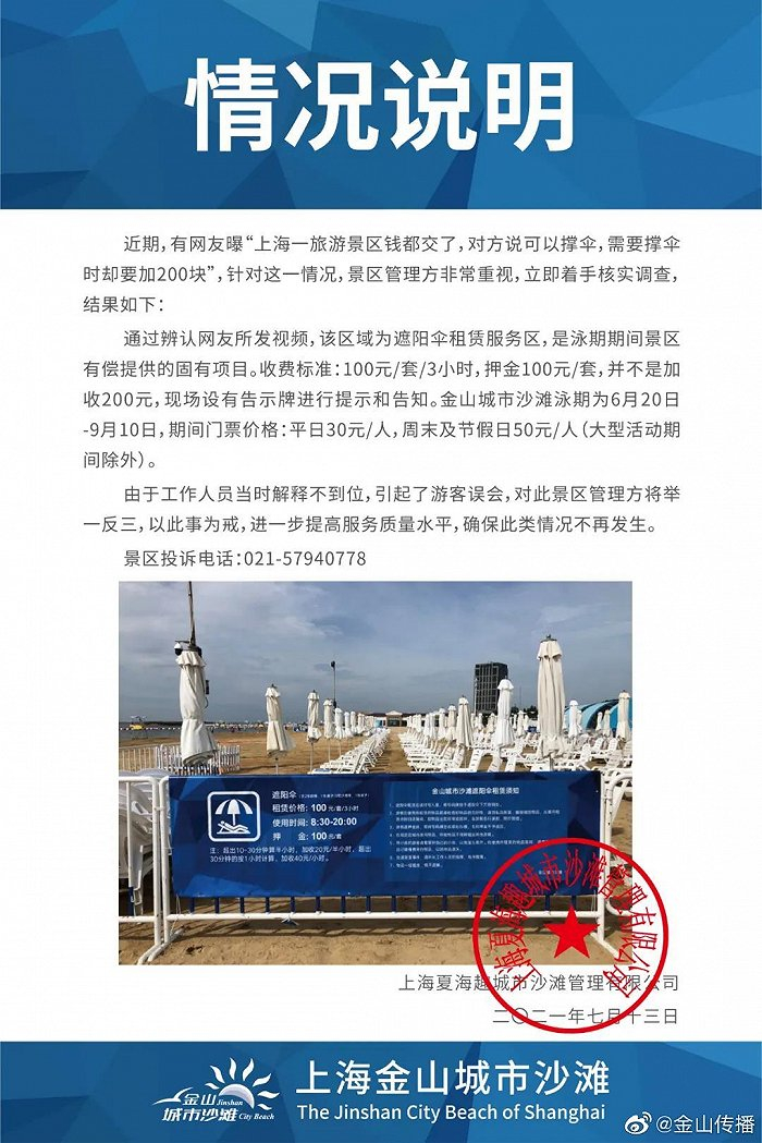 据上海@金山传播 7月13日消息,近期,有网友曝:“上海一旅游景区钱都交了,对方说可以撑伞,需要撑伞时却要加200块”,针对这一情况,金山城市沙滩管理方非常重视,立即着手核实调查,结果如下:通过辨认网友所发视频,该区域为遮阳伞租赁服务区,是泳期期间景区有偿提供的固有项目。收费标准:100元/套/3小时,押金100元/套,并不是加收200元,现场设有告示牌进行提示和告知。金山城市沙滩游泳期为6月20日-9月10日,期间门票价格:平日30元/人,周末及节假日50元/人(大型活动期间除外)。