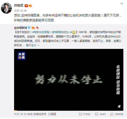 7月13日,电影《失孤》中的另一位主演井柏然也在个人微博上发文,祝福《失孤》原型郭刚堂父子团聚,“愿天下无拐”。