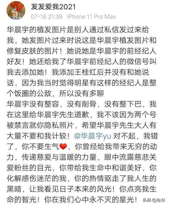 7月16日晚,仅仅过了几个小时,该网友公开道歉说:“华晨宇没有整容,没有削骨,没有整下巴,我在这里给华晨宇先生道歉。我不该因为两个号被禁言就你隐私照片,希望华晨宇先生大人有大量不要和我计较。”