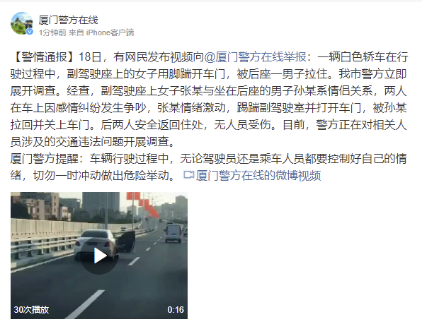 原标题:厦门警方通报“轿车行驶过程中女子踹开车门被男子拉住”:系情侣关系