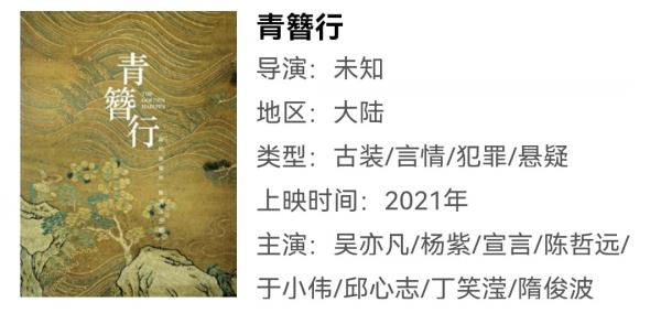 吴亦凡待播影视作品中,目前最受关注的是与演员杨紫合作的古装剧《青簪行》,预计也将受到影响。该剧改编自同名小说,由企鹅影视、新丽传媒和凤凰联动影业联合出品,播出平台已敲定腾讯视频,投资金额据传“好几个亿”,但具体数目未知。
