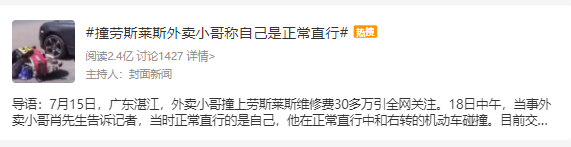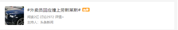 一时间,#外卖小哥撞上劳斯莱斯维修费30多万##外卖员回应撞上劳斯莱斯##撞劳斯莱斯外卖小哥称自己是正常直行#等话题在热搜榜上居高不下。
