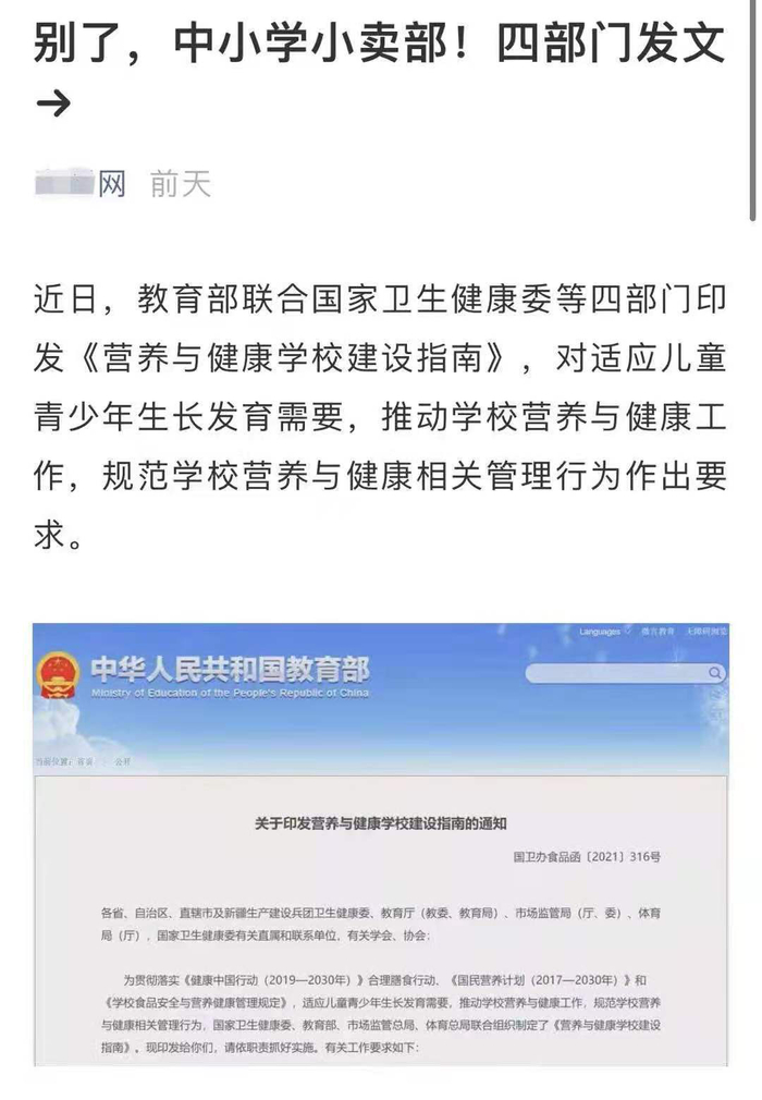 法治周末记者查询发现,该消息源自国家卫生健康委、教育部、市场监管总局、体育总局等四部门印发的《营养与健康学校建设指南》(以下简称《指南》)。《指南》第二十五条明确规定:“不得在校内设置小卖部、超市等食品经营场所,不得售卖高盐、高糖及高脂的食品和酒精饮料”。该《指南》下发日期为2021年6月7日。