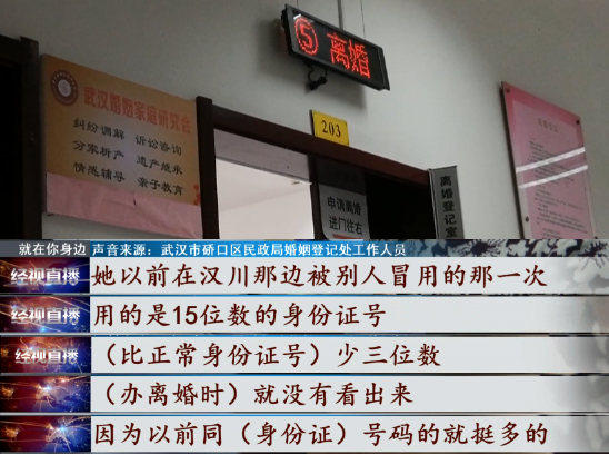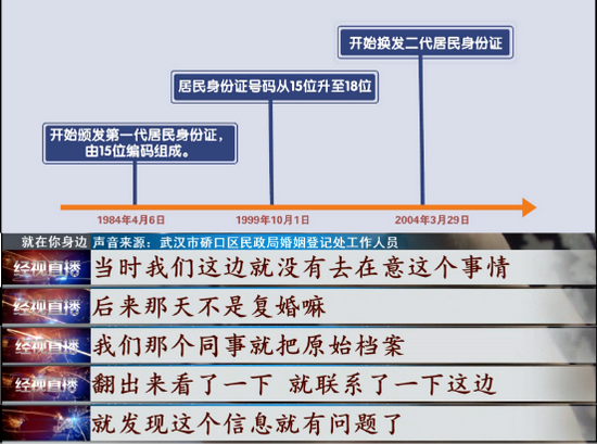 据了解,我国从1984年4月6日开始颁发第一代居民身份证,由15位编码组成。1999年10月1日起居民身份证号码从15位升至18位。2004年3月29日开始换发二代居民身份证。硚口区婚姻登记处工作人员解释称,先前在婚姻登记数据录入时,有时会产生同一个身份证号下面好几个人的情况,因而在审核时容易出现误差。