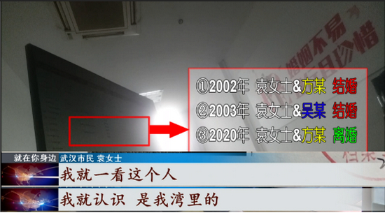 4月23日,记者陪同袁女士来到武汉市硚口区民政局婚姻登记处,工作人员在系统中输入袁女士的身份信息,显示了三条记录,分别是:2002年她与方某的结婚登记,2003年她与一名吴姓男子的结婚登记,以及2020年她与方某的离婚登记。
