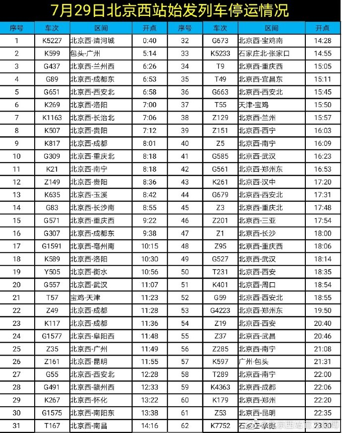 据@北京西站官方微博 消息,受河南多地遭遇持续强降雨天气影响,7月29日北京西站62趟始发列车停运。