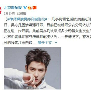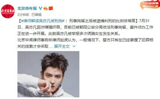 7月31日,吴亦凡因涉嫌强奸罪,目前已被朝阳公安分局依法刑事拘留,案件侦办工作正在进一步开展。此前吴亦凡被举报多次诱骗女生发生关系。